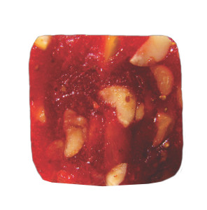 Состав: сахар, вода, клюква, клубника органическая, бразильский орех, крахмал, рисовая мука, паприка, гвоздика.